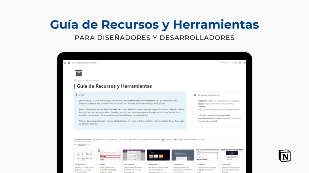 Actualizo esta guía mensualmente con nuevos recursos que descubro. ¡No pierdas más tiempo! Obtén tu guía de recursos y herramientas ahora mismo.